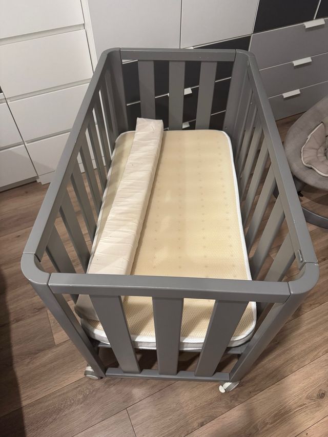 Cuna colecho Doco de color gris. Incluye colchón. - Estructura de madera. - Ruedas para facilitar el movimiento.