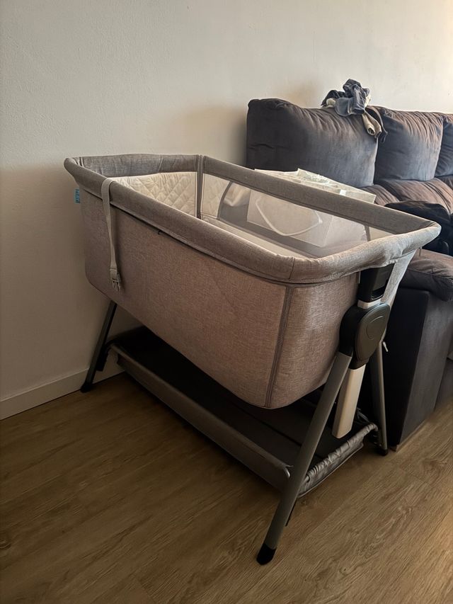 Detalles del productoCuna colecho de color gris, con lateral de malla transpirable y estructura plegable.