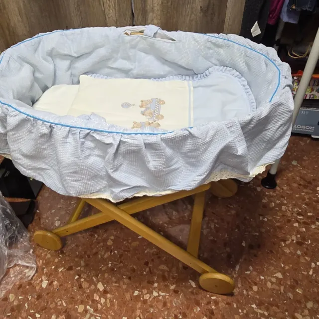 Detalles del productoCuna de bebé en color azul, con un bonito estampado de ositos en la ropa de cama.