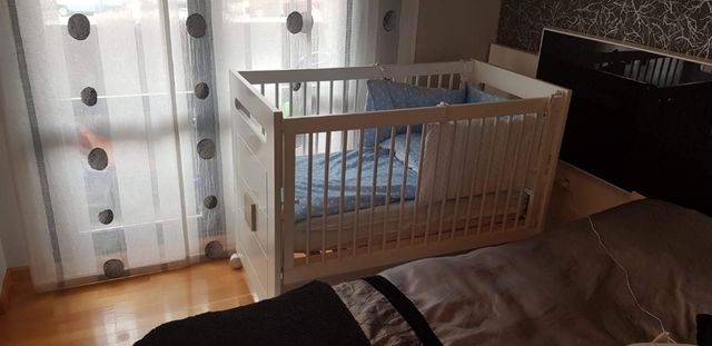 Cuna de bebé en buen estado, ideal para las primeras etapas. - Estructura de madera blanca. - Laterales de barrotes. - Incluye colchón