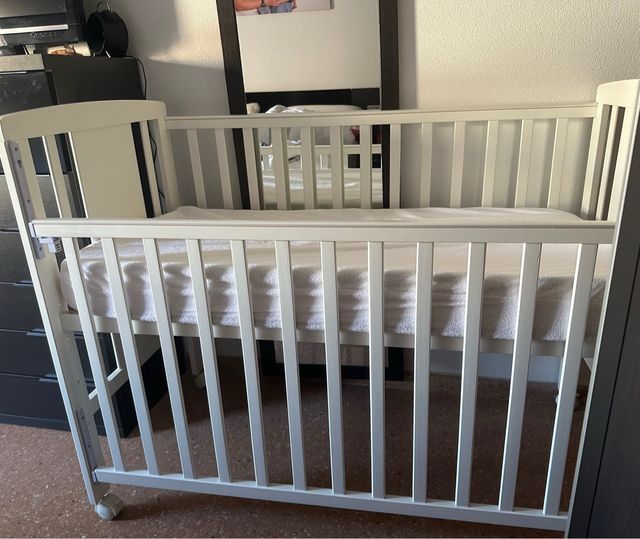 Detalles del productoCuna de bebé de color blanco, ideal para recién nacidos. Es un mueble esencial para el descanso del bebé.