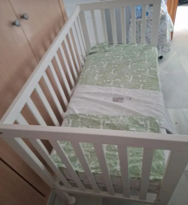 Cuna de bebé de color blanco, con un diseño clásico y seguro. Conjunto colchón sin uso. - Barreras de seguridad. - Ruedas para facilitar el movimiento.
