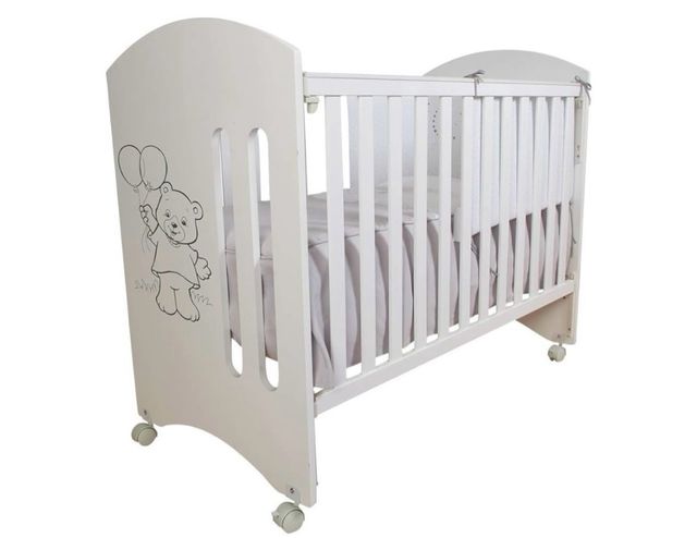 Cuna de bebé en color blanco, con un tierno diseño de osito y globos. - Estructura de madera. - Ruedas para facilitar el movimiento. - Barandillas de seguridad.