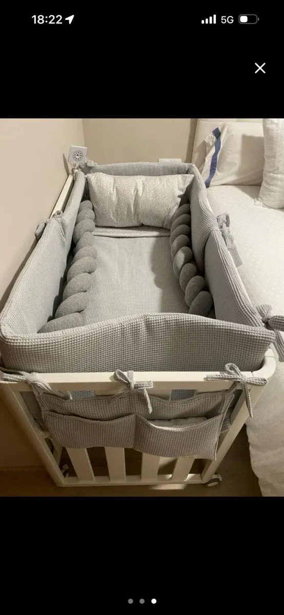 Detalles del productoCuna de bebé con un diseño moderno y acogedor. Incluye un protector lateral trenzado para mayor seguridad.