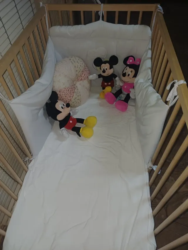 Cuna de bebé de madera, ideal para un descanso seguro y cómodo. - Estructura de madera natural. - Incluye protector de cuna blanco. - Peluches de Mickey y Minnie incluidos.