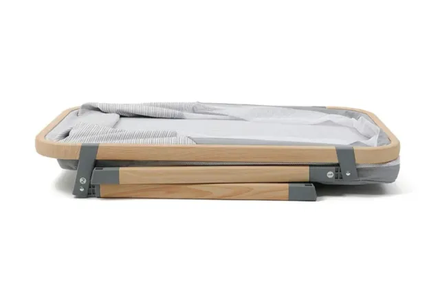 Detalles del productoCuna de bebé con un diseño moderno y funcional, ideal para espacios reducidos o para llevar de viaje. Su estructura combina madera y metal.