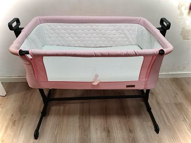 Cuna de bebé en color rosa, ideal para los primeros meses. - Estructura plegable. - Laterales de malla transpirable. - Incluye colchón. - Ruedas para facilitar el movimiento.
