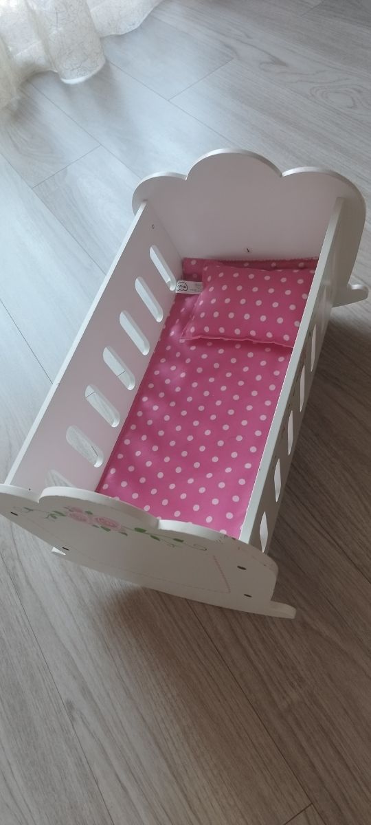 Detalles del productoCuna de juguete de madera blanca, ideal para muñecas. Incluye un cojín y un colchón con estampado reversible de lunares fucsia y rayas rosas