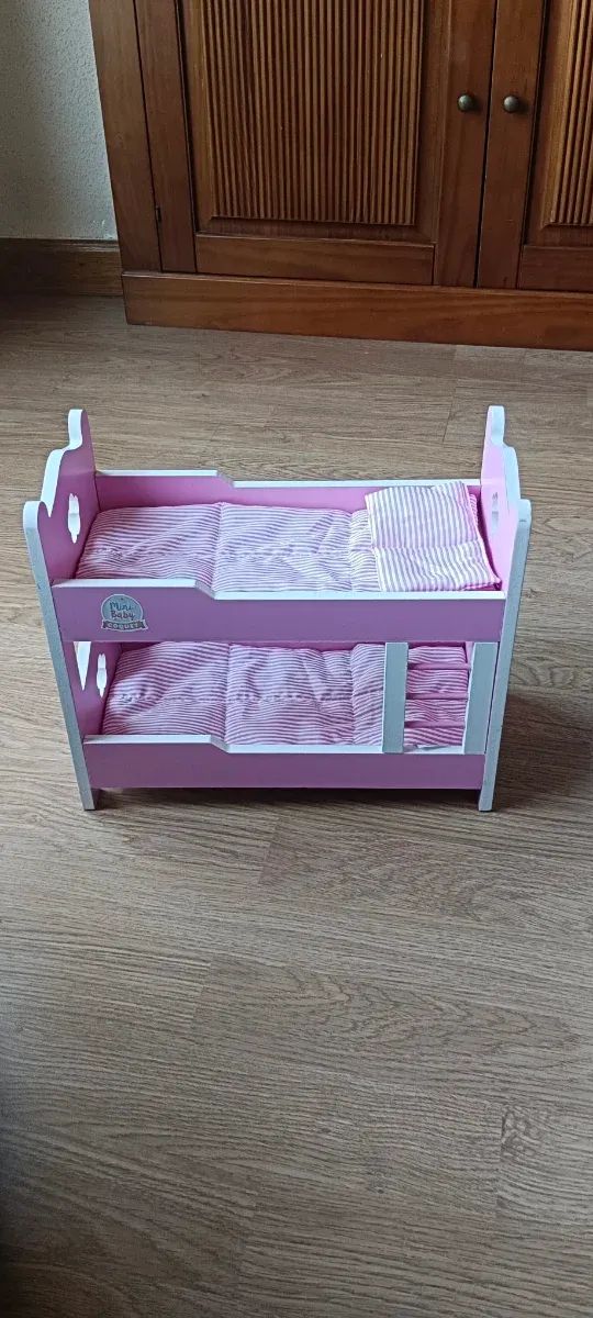 Detalles del productoCuna de juguete de dos pisos para muñecas, con un diseño en color rosa y blanco.
