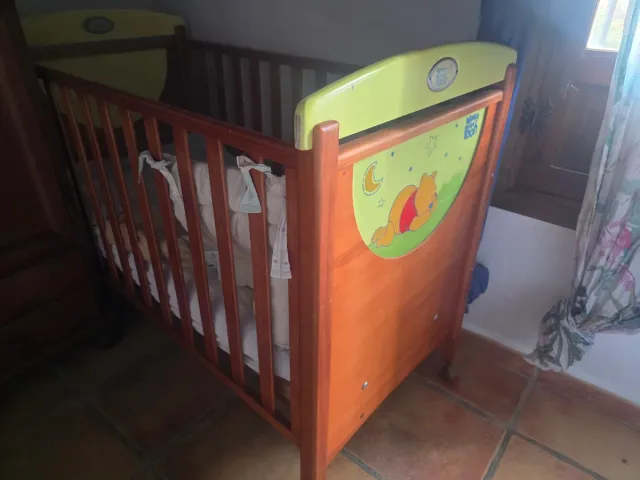 Detalles del productoCuna de madera con un diseño infantil de Winnie the Pooh y un colchón de látex.