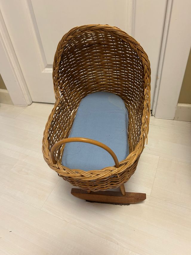 Adorable cuna de mimbre tejida a mano, perfecta para jugar. Hecha a mano en los 80. - Material: Mimbre natural. - Base mecedora de madera. - Incluye colchón azul.