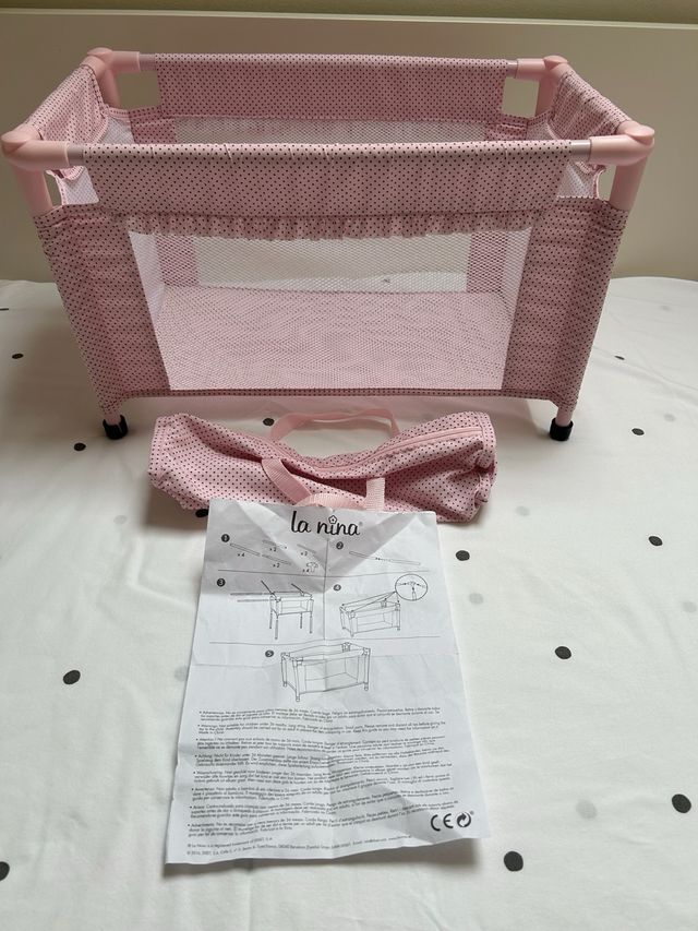 Detalles del productoCuna de muñecas plegable marca La Nina, lleva bolsita de trasporte e instrucciones de montaje, esta perfecta menos una de las gomas de una pata que tiene una raja el plastico. Medidas del producto