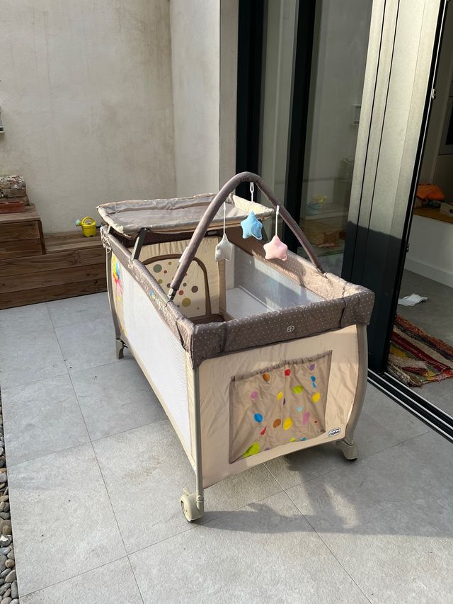 Cuna de viaje. cuna plegable, con cambiador y cama interior alta. guardada mide 70x25x25