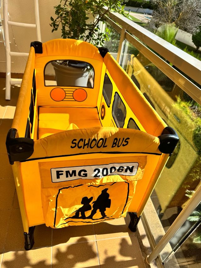 Detalles del productoCuna de viaje con un divertido diseño de autobús escolar, de color amarillo
