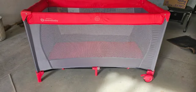 Cuna de viaje de la marca Asalvo, con estructura plegable y ruedas. - Color rojo y gris. - Laterales de malla transpirable. - Ruedas para facilitar el transporte.