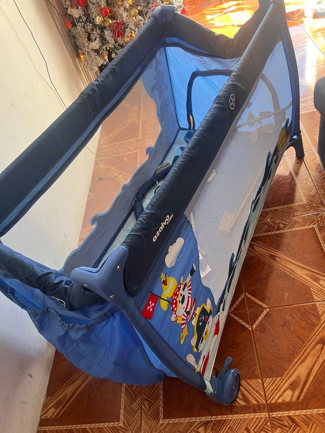 Cuna de viaje de la marca Asalvo, ideal para transportar. - Color azul. - Diseño con personajes. - Ruedas para facilitar el movimiento.