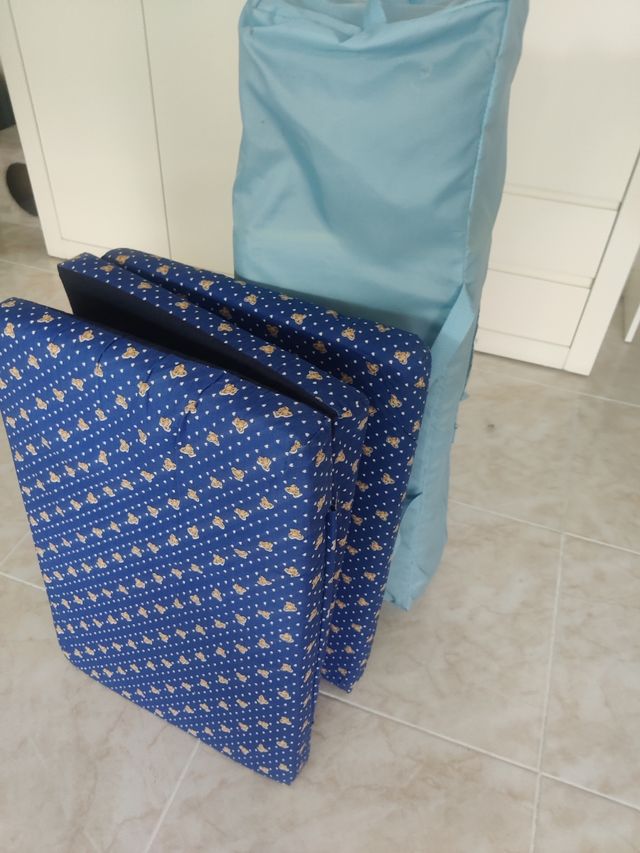 Detalles del productoPráctica cuna de viaje con un alegre estampado de ositos en fondo azul. Incluye una bolsa de transporte. Incluye también colchon, 2 protectores, 2 bajeras y sabana y funda almohada.