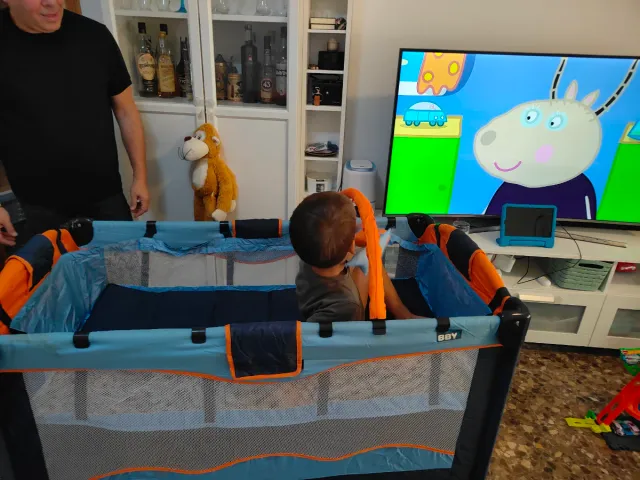 Detalles del productoCuna de viaje BBY de color azul y naranja.