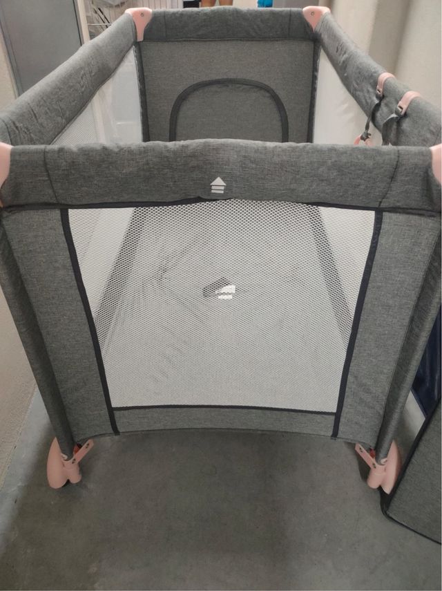 Detalles del productoCuna de viaje de color gris con detalles en rosa, ideal para transportar.