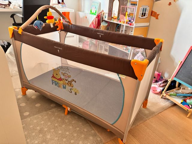 Detalles del productoCuna de viaje con diseño infantil de Winnie the Pooh y Tigger.