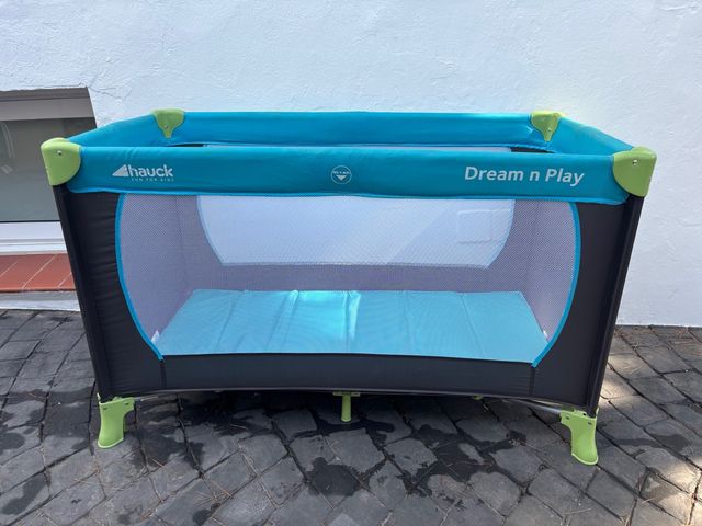 Cuna de viaje Hauck Dream n Play en color azul y gris. - Incluye mosquitera. - Estructura resistente y segura. - Fácil de montar y desmontar.