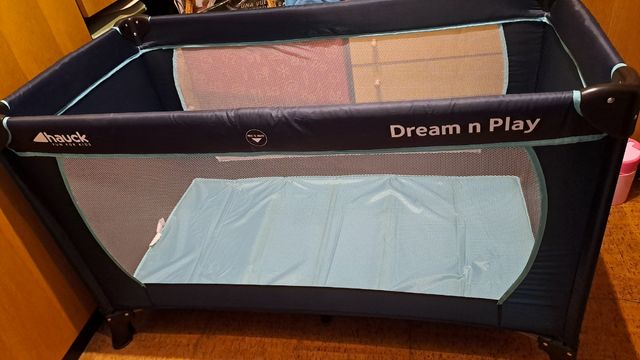 Detalles del productoCuna de viaje plegable, con colchón. 125*65*76(altura), hasta 15kg (1mes-3 años). Marca Hauck. Modelo Dream'n'Play. Color azul marino y turquesa. Con ventanas de tejido de malla, permite transpiración. Cremallera lateral (se lo pasará genial entrando y saliendo). Con bolsa de transporte. Muy fácil de montar y de desmontar. En muy buen estado, poco uso. Medidas del producto