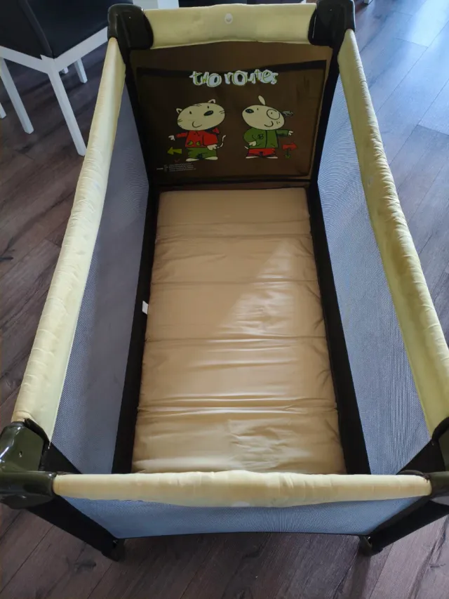Detalles del productoCuna de viaje de la marca Jane, ideal para transportar y usar en diferentes lugares. Presenta un diseño con dos simpáticos personajes animados en la parte superior.