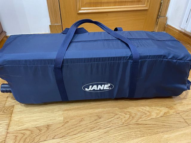 Detalles del productocuna de viaje con la Funda de transporte para cuna de viaje de la marca Jane. Es de color azul marino y cuenta con asas para facilitar su transporte.