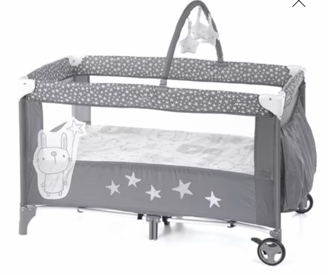 Detalles del productoCuna de viaje Jane One Level con diseño de estrellas y conejito.