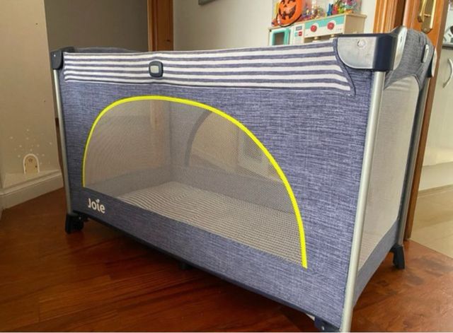 Cuna de viaje Joie, muy práctica y fácil de transportar. Incluye soporte para bebé. - Diseño plegable. - Laterales de malla con cremallera - Estructura resistente.