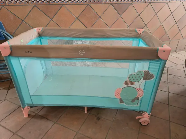 Detalles del productoCuna de viaje de la marca Olmitos, en color azul turquesa y detalles en rosa y beige. Incluye colchón.