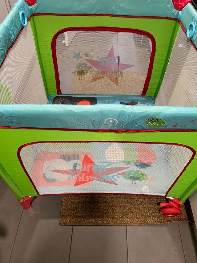 Cuna de viaje Olmitos en color verde y azul, con un divertido estampado. Es ligera y fácil de montar. - Abertura lateral. - Diseño con estrellas y pájaros.