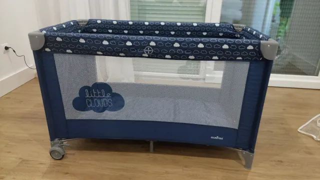 Detalles del productoCuna de viaje de la marca Olmitos con un diseño de nubes y colchón.