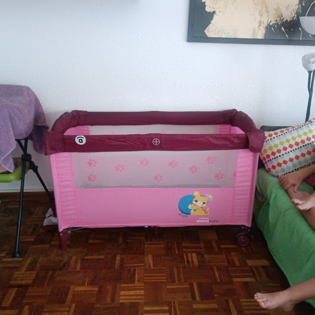 Detalles del productoCuna de viaje de color rosa, ideal para bebés. Cuenta con un diseño divertido con huellas y un simpático tigre.