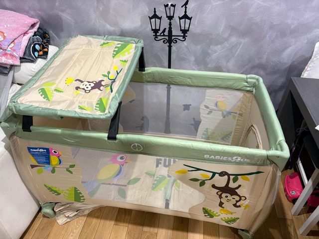 Detalles del productoCuna de viaje con diseño infantil de animales y vegetación.