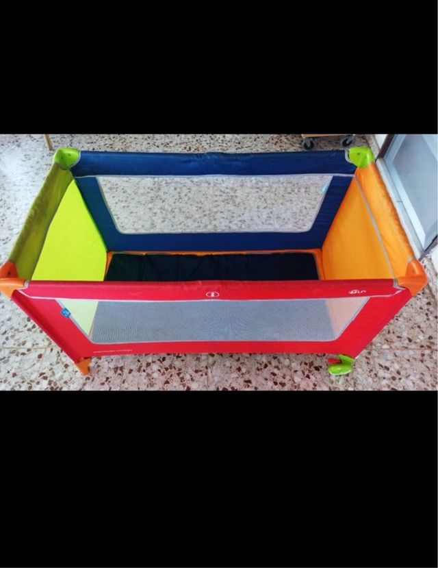 Cuna de viaje de colores vivos, fácil de montar y desmontar. - Estructura resistente. - Laterales de malla transpirable. - Plegable para transporte y almacenamiento.