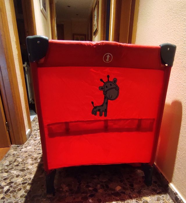 Se vende cuna de viaje de color rojo y se regala hamaca. - Estructura de tela roja. - Esquinas con protectores negros. - Dibujo de jirafa en el lateral.