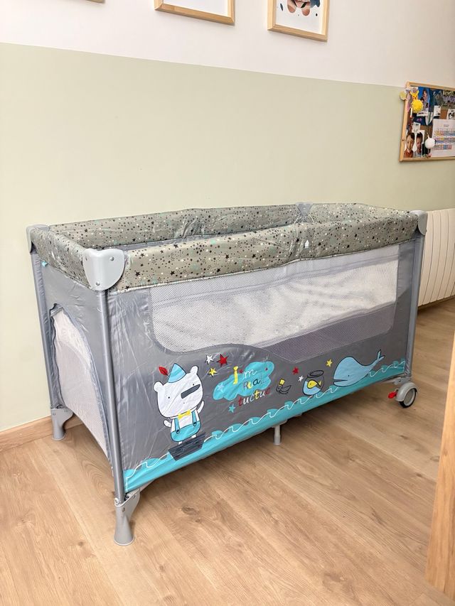 Cuna de viaje Tuc Tuc con un divertido diseño. Tiene dos posiciones de altura. Incluyo de regalo colchón plegable y mosquitera a estrenar
