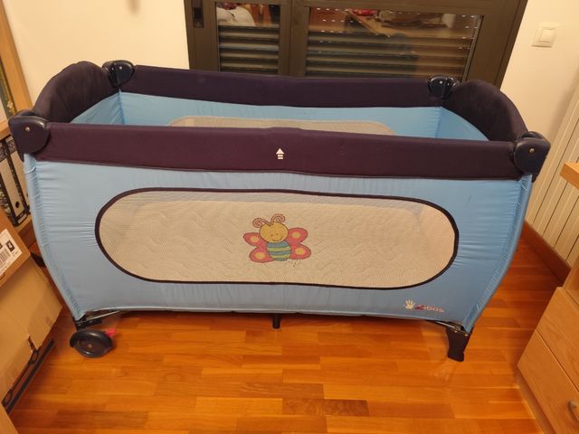 Cuna de viaje de color azul con un simpático dibujo de mariposa. - Laterales de malla para ventilación. - Ruedas para facilitar el transporte. - Marca Zibos.