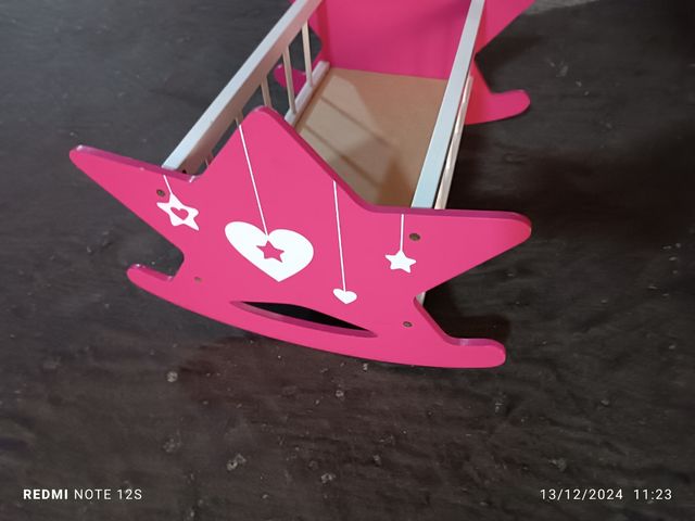 Detalles del productoCunita mecedora estrella de madera. Cunita estrella mecedora para muñecas realizada en madera. Incluye colchita. Medidas cunita: 44,5 x 40 x 29 cm. Medida caja aprox.: 43,6 x 5 x 30 cm