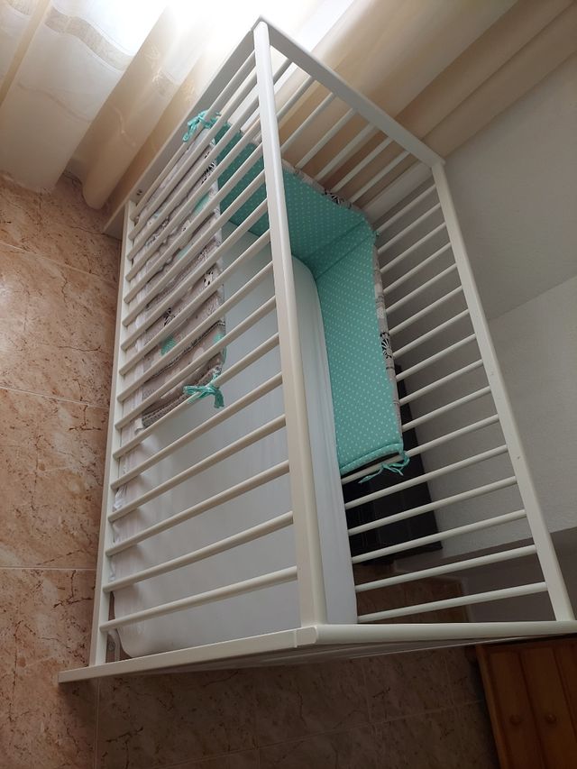 Detalles del productoSe vende conjunto de cuna Gulliver, colchón muelles ensacados JÄTTETRÖTT (el mejor de Ikea), chichonera, protector de colchón, 2 juegos de sábanas completos y 3 bajeras más.