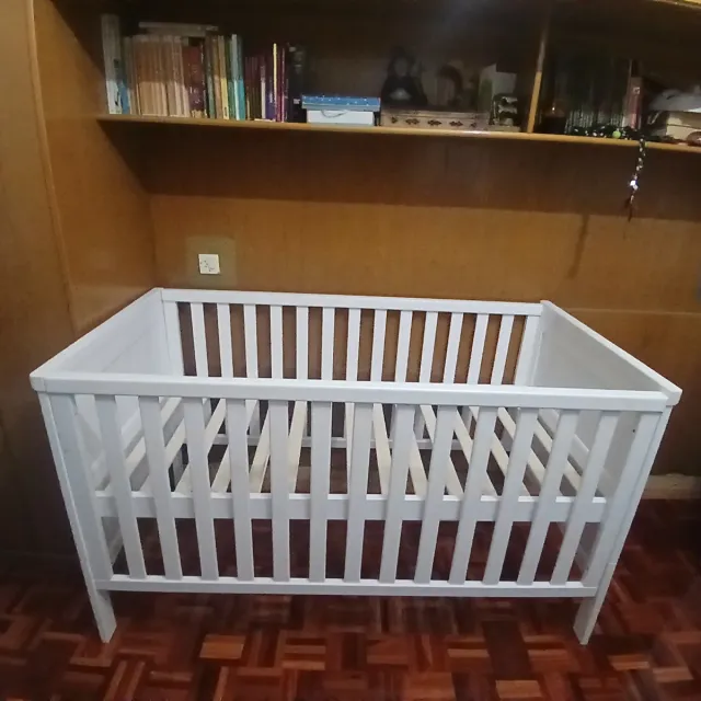 Detalles del productoCuna blanca de madera, se puede quitar un lado para hacerlo cama hasta los 5 años. Tiene una barrera que se puede acoplar para que no se caiga de la cama.