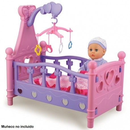 Detalles del productoCuna para muñecas bebé, ideal para jugar. Es de color rosa y morado, con detalles en forma de corazón. Incluye móvil musical. - Cuna de plástico resistente. - Diseño adorable con corazones y mariposas. - Perfecta para muñecas de tamaño pequeño o mediano. - El móvil tiene varios colgantes coloridos.