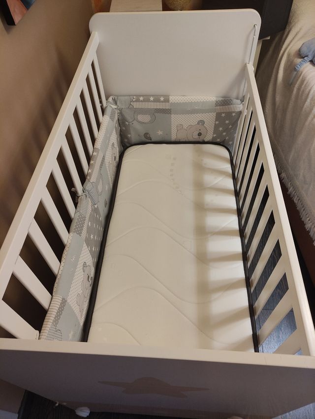 Detalles del productoCuna de madera blanca con un dibujo de estrella en marrón,tiene 2 alturas,barandilla que se baja y con botones de seguridad para que el niño no pueda manipular,4 ruedas,2 de ellas con freno.esya en perfecto estado lo único tiene una marca que se aprecia en la última foto de haber puesto un carrusel de muñequitos.se puede pintar un poco ese roce.el colchón está en perfecto estado sin manchas ni olores siempre ha estado con protector,es de mac colchón.se vende junto cuna y colchón y regalo chichonera en perfecto estado sin manchas ni olores.se ha usado todo muy poco. Medidas del producto