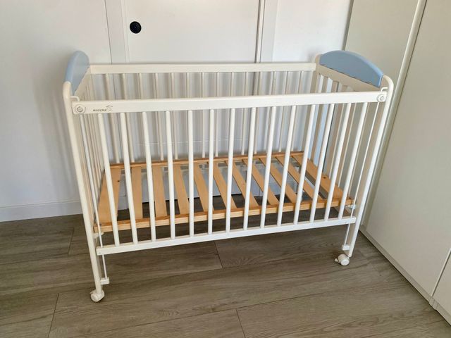 Detalles del productoCuna Micuna para bebé, en buen estado. Ideal para los primeros meses de tu bebé. Estructura de madera blanca con cabeceros en azul. Somier de láminas. Con ruedas frenables que facilitan . En buen estado con pequeñas marcas. Medidas completas: 120 x 65 x 100 (largo x ancho x alto). Para colchón de 115x55 cm. Dos posiciones de altura del colchón. También dos posiciones de altura de la barrera frontal, la cual se puede quitar para facilitar el colecho.