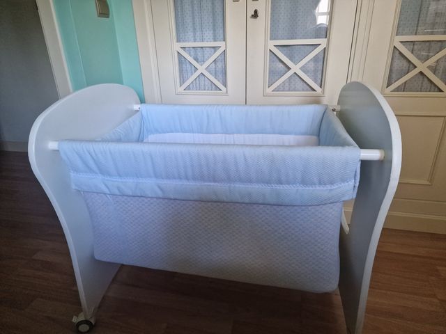 Detalles del productoPreciosa minicuna de madera blanca con detalles en azul celeste. Es perfecta para los primeros meses del bebé.