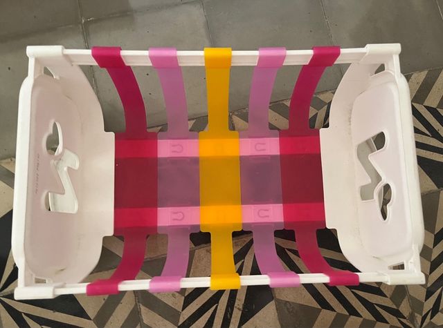 Cuna de plástico blanco para muñecas Nenuco. Incluye cintas de colores para decorar. - Diseño con formas de corazón y M. - Cintas de colores: rosa, lila y amarillo.