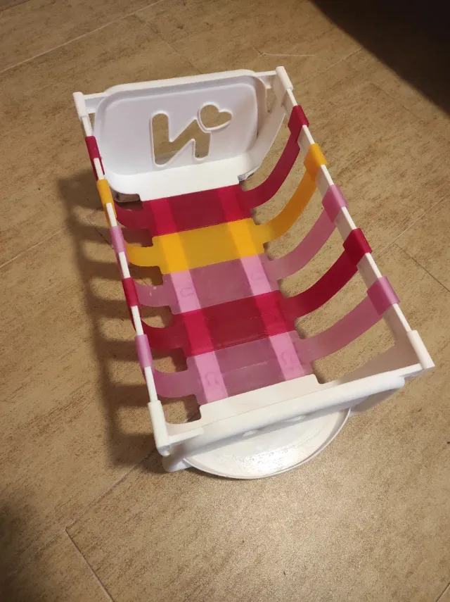 Detalles del productoCuna de plástico blanco para muñecas Nenuco. Tiene un diseño con tiras de colores en tonos rosa, rojo y amarillo.