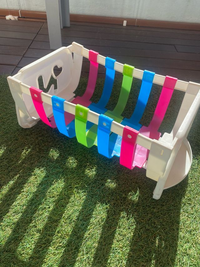 Detalles del productoCuna de plástico blanco para muñecos Nenuco. Tiene tiras de colores (rosa, azul, verde) que forman la base.