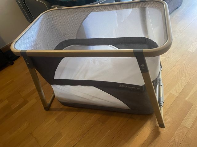 Detalles del productoCuna parque infantil de la marca Kindercraft, ideal para bebés. Su diseño combina tonos grises y beige con detalles en madera.